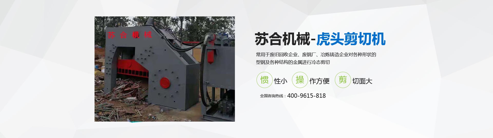虎頭剪具有體積小、重量輕、慣性小、噪音低、動(dòng)作平穩(wěn)、操作方便、靈活、剪切斷面大、剪刀口調(diào)整方便等優(yōu)點(diǎn),操作使用安全。常用于廢舊回收企業(yè)、廢鋼廠、冶煉鑄造企業(yè)對各種形狀的型鋼及各種結(jié)構(gòu)的金屬進(jìn)行冷態(tài)剪切。剪切機(jī)的用途就是用來剪切定尺、切頭、切尾、切邊、切試樣及切除軋件的局部缺陷等。 滑縣蘇合機(jī)械制造有限公司性能穩(wěn)定,操作簡單。歡迎來電咨詢 <了解更多>
